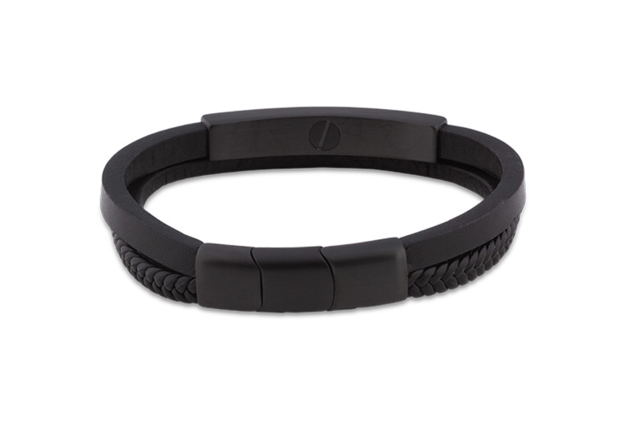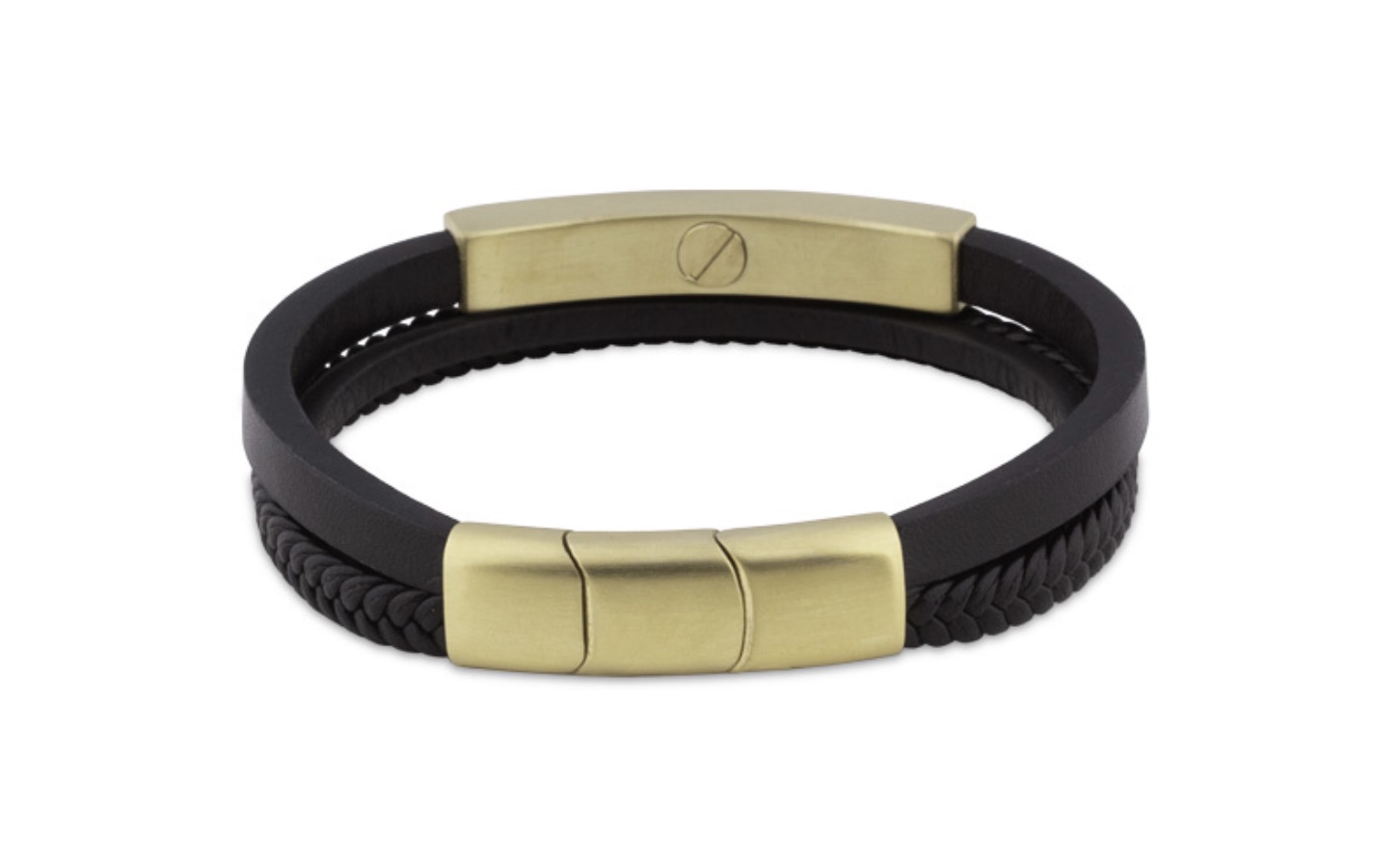 De armband is verkrijgbaar in een zwart lederen band met zwarte of goudkleurige sluiting.