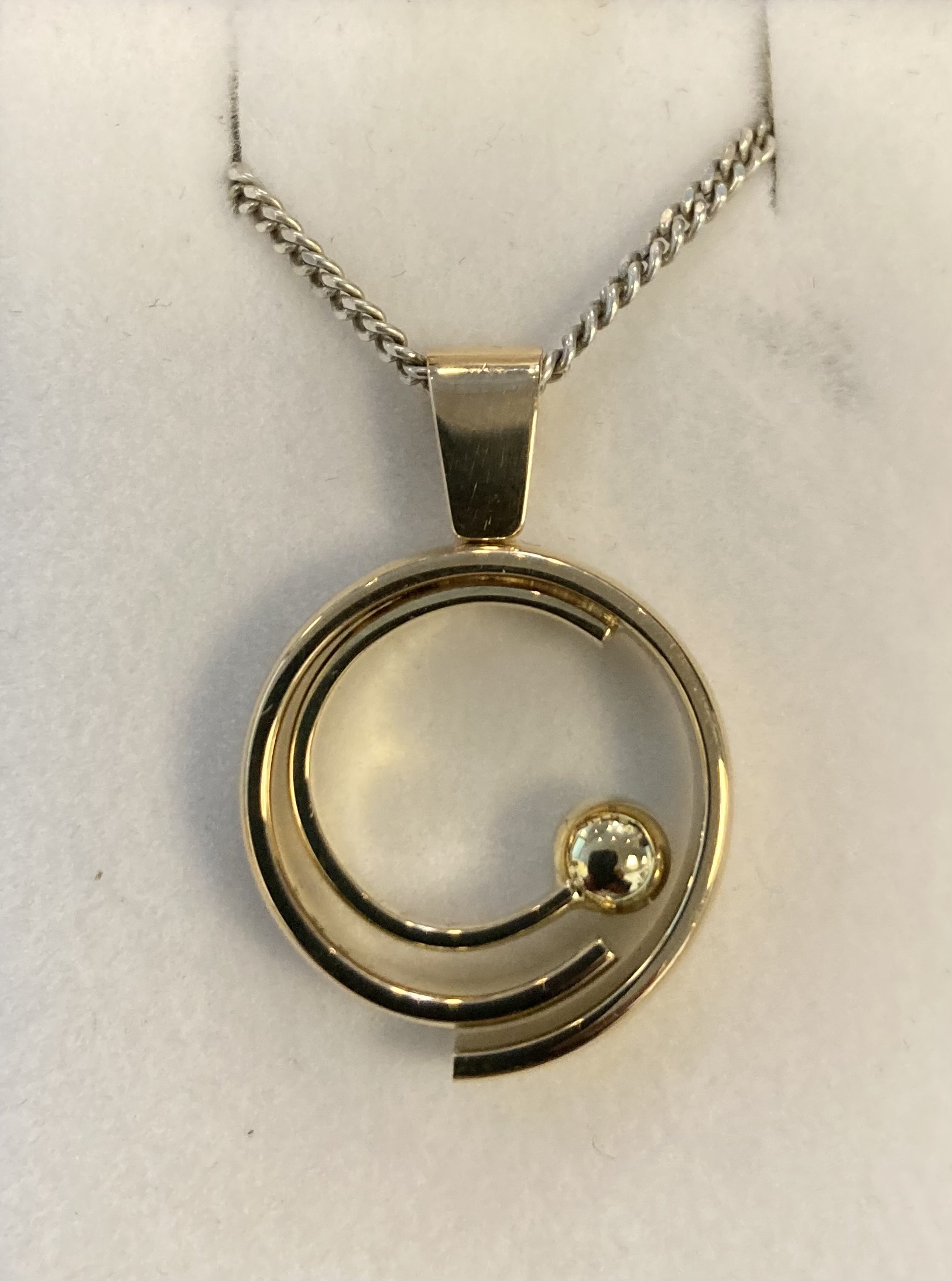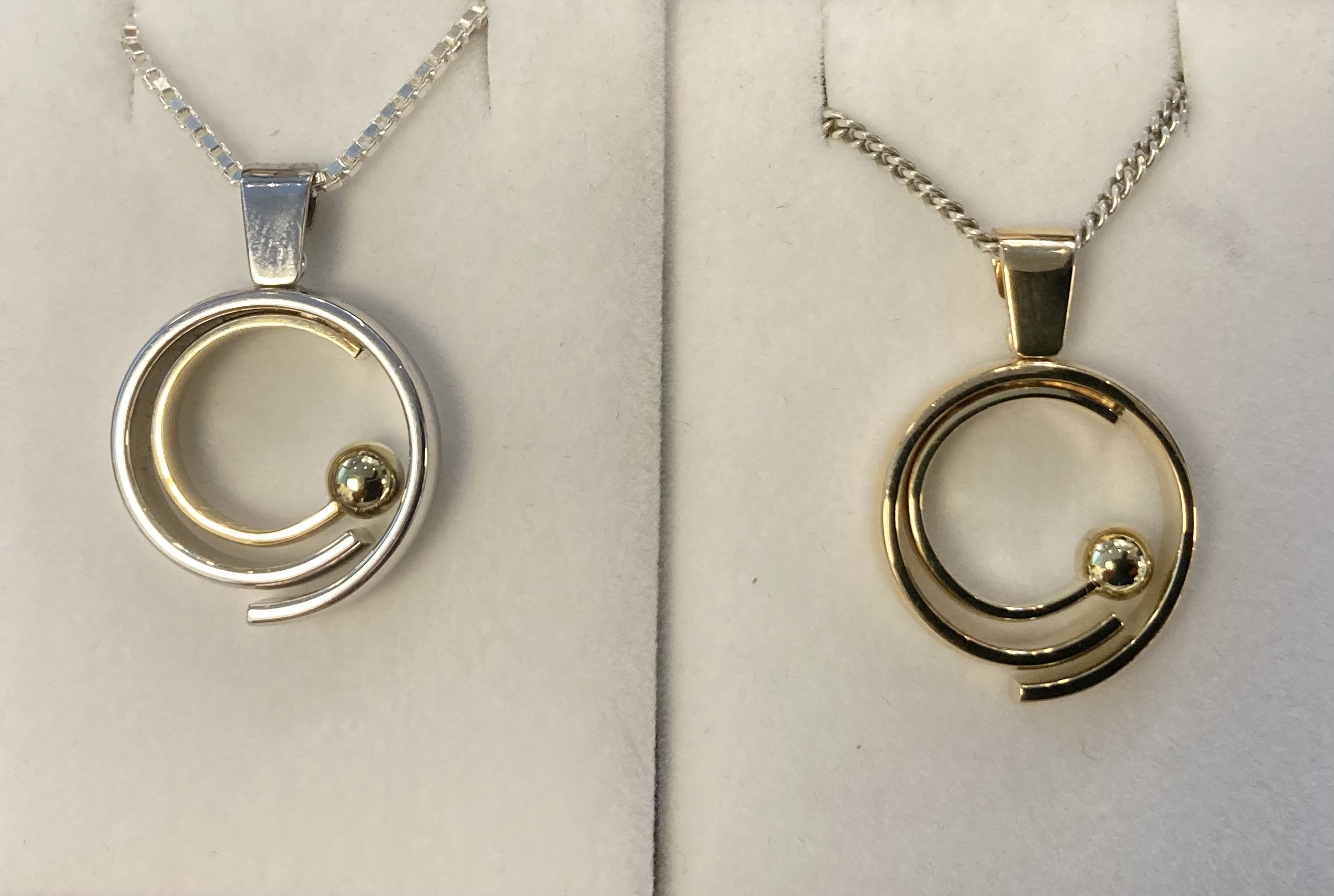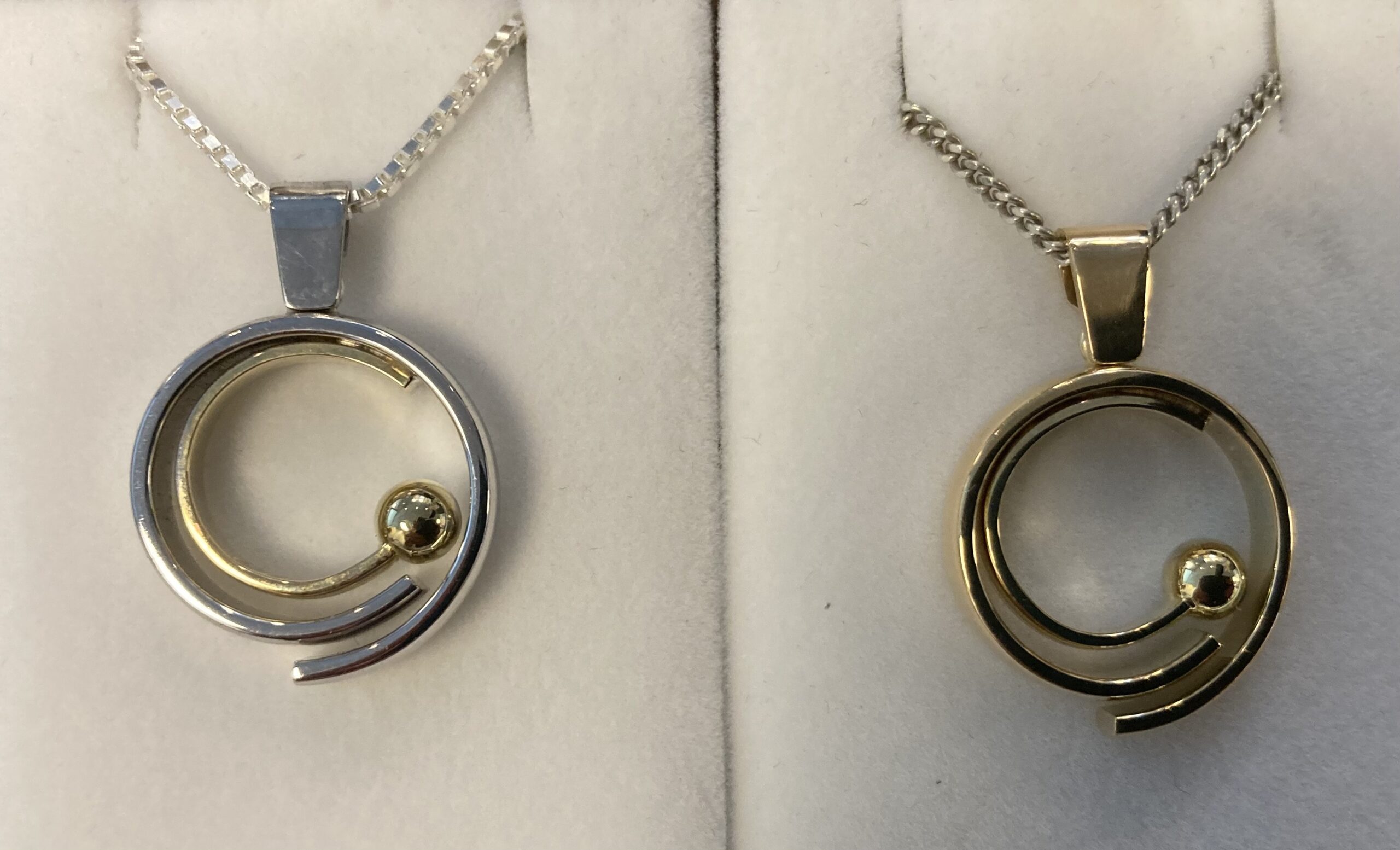 Hanger vervaardigt door onze edelsmid, van bestaande trouwring(en) waar het crematie-as in de bol verwerkt is. (Combinatie van zilver met goud)