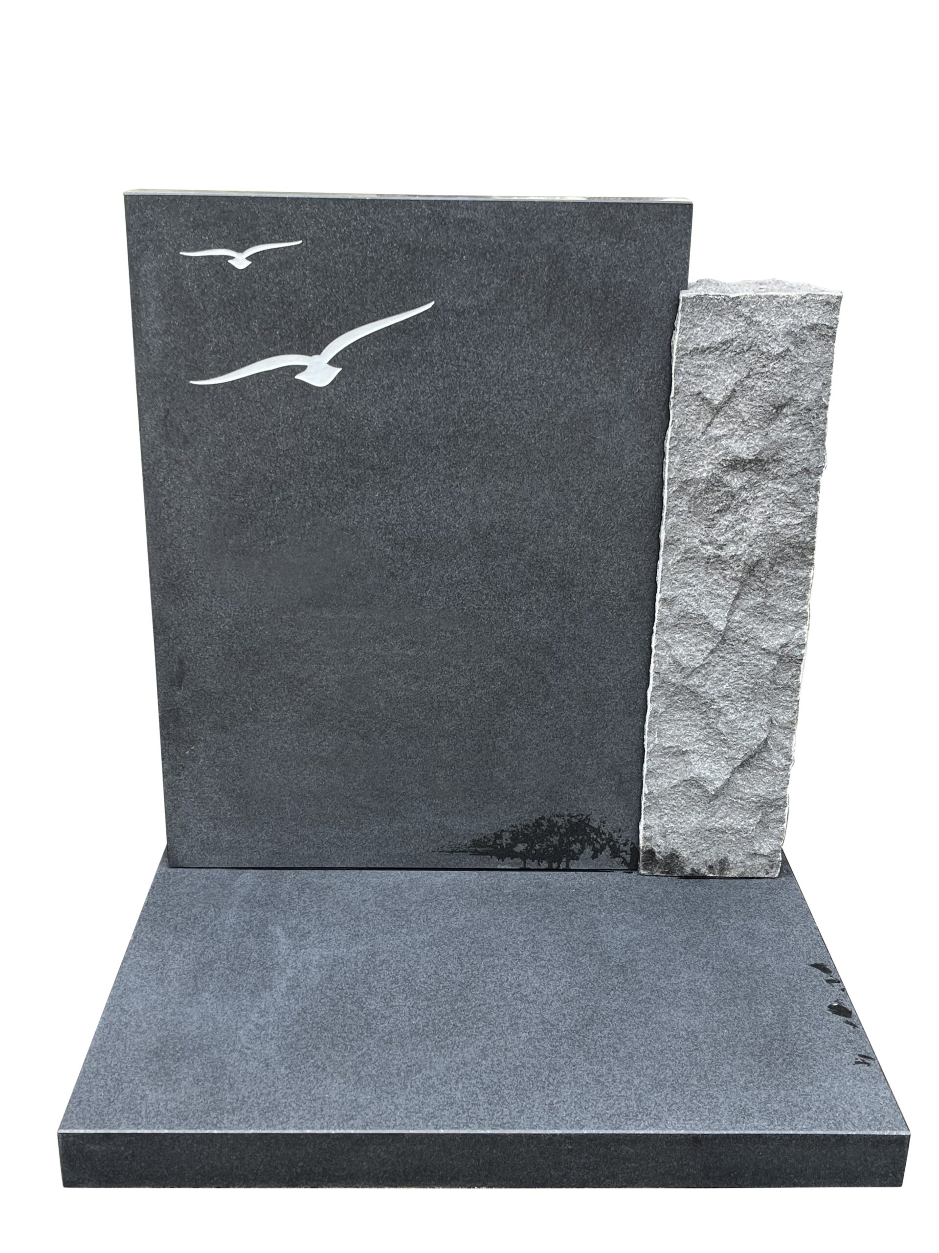 Zerk met staande rechte steen in ‘gezoet’ Black Premium graniet, met aan de rechterzijde een ruw behakte pilaar. Dit monument kan verzorgd worden in de door u gewenste granietkleur.
