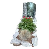 Schitterend ruw grafmonument waarin een geprintte glasplaat met een bossage is verwerkt....