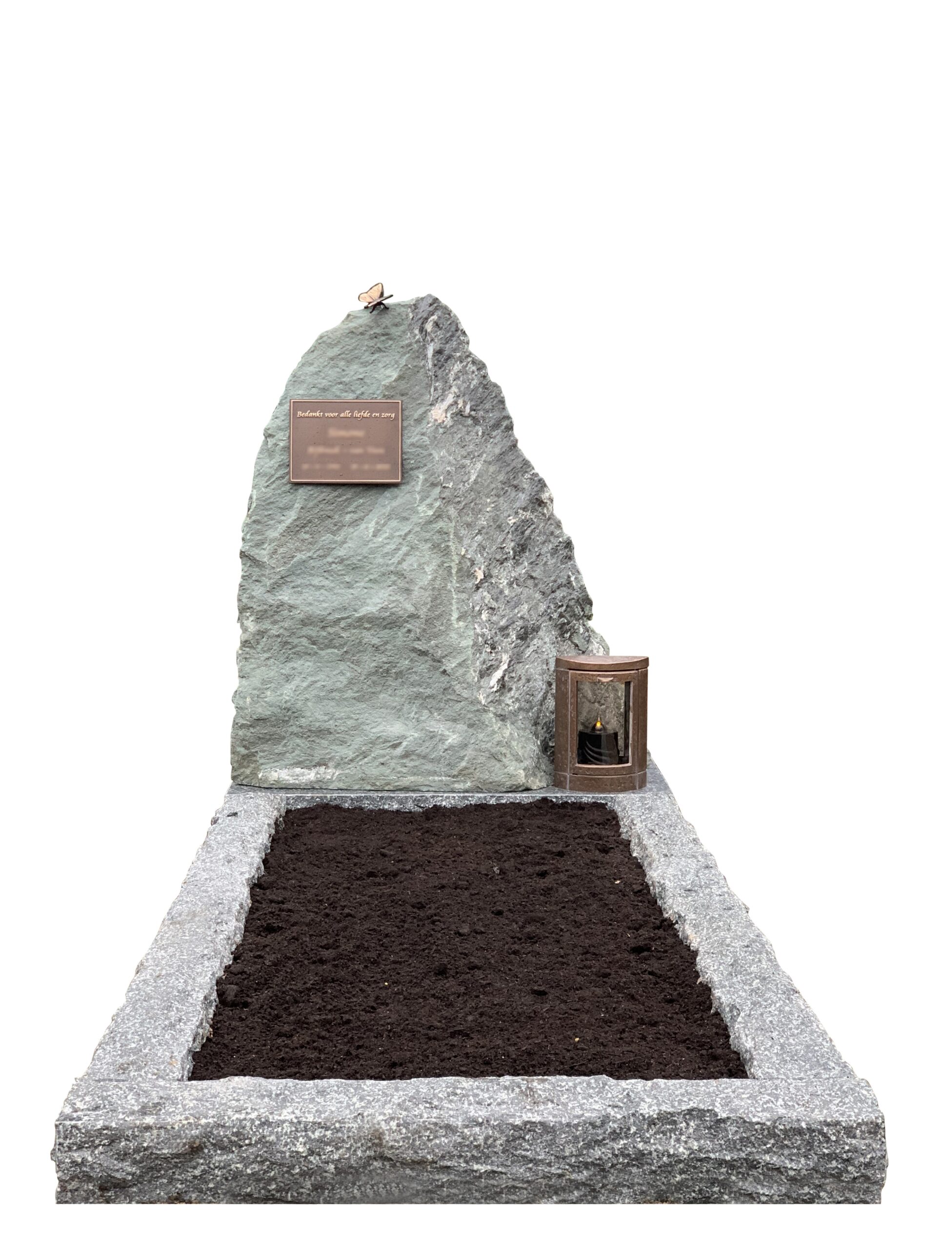 Unieke ruwe steen Sea Green. Een prachtig ruw monument, waarbij het bandenstel van ruw behakt graniet is gemaakt. Om zo de ruwe uitstraling te behouden. Op de ruwe steen kan een bronspaneel met tekst worden geplaatst of er kunnen opliggende bronzen of aluminium letters gebruikt worden.