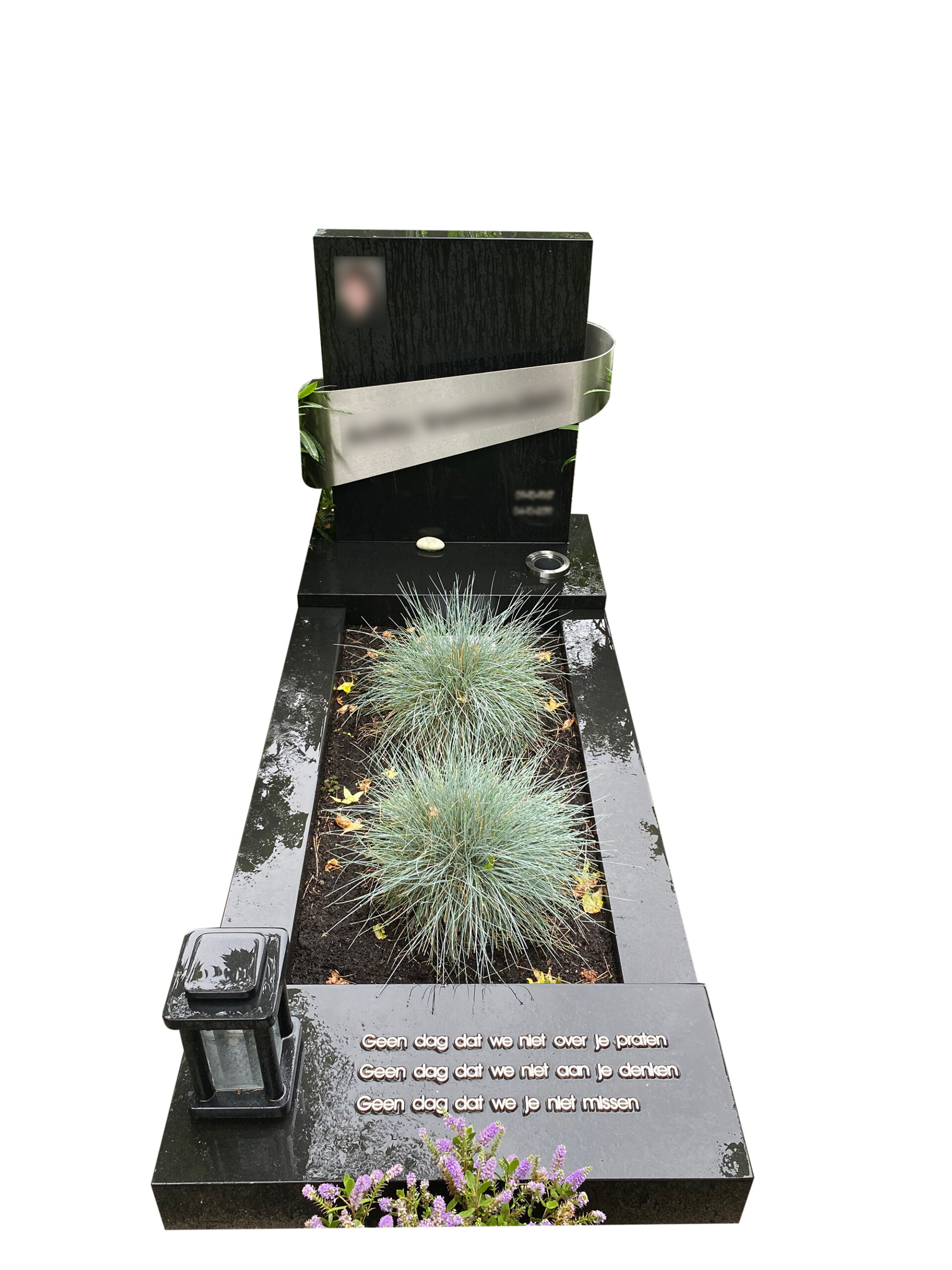 Prachtig strak monument in Black Premium graniet, waar een RVS sjerp de letterplaat omarmd waarbij een tekst uit-gelaserd kan worden.
