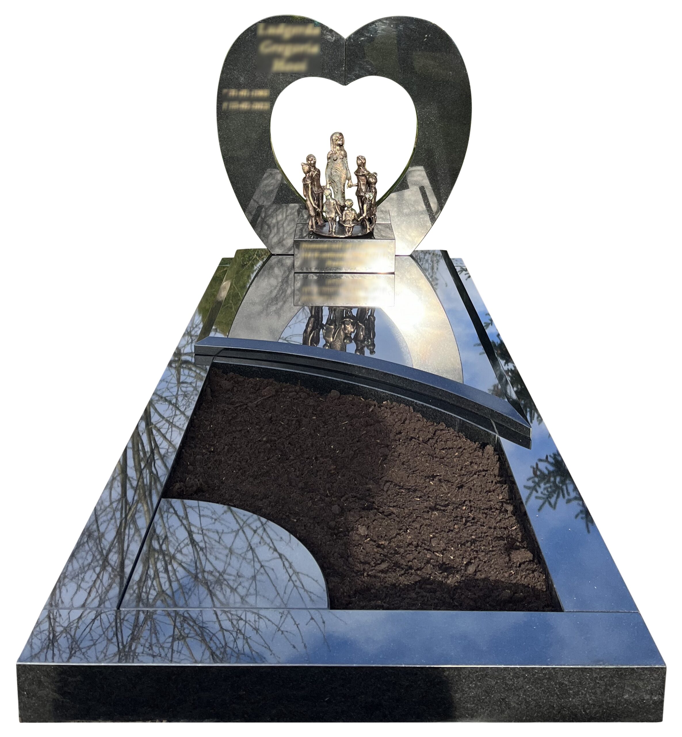 Prachtig monument in ‘polished’ Black Premium met een ‘doorkijk’ Hart, waar een persoonlijk ornament voor geplaatst kan worden. Bij het liggende gedeelte is een tuinvak gecreëerd in een speelse vorm.