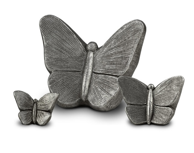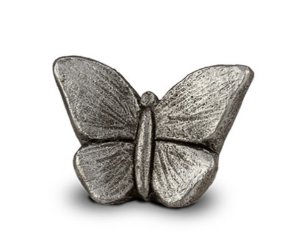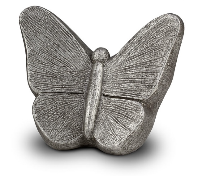 Bij deze urn staat de symboliek van de vlinder centraal. De zorgvuldig uitgewerkte details en de bijzondere zilverkleur zorgen ervoor dat deze creatie niet direct herkend wordt als urn, maar als kunstwerk.