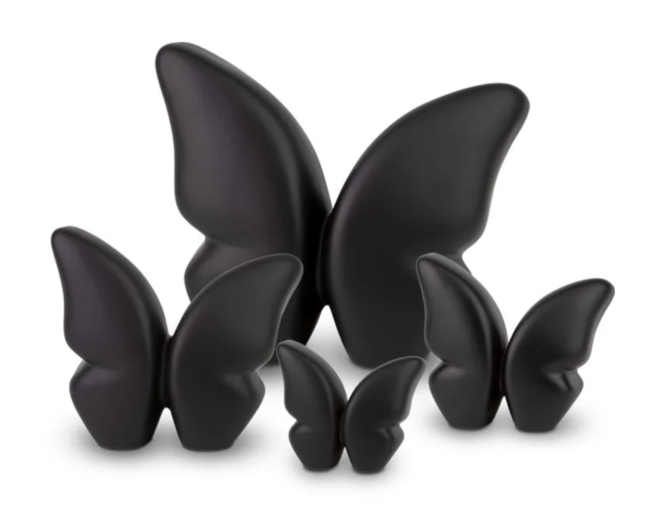 Deze grote keramische urn, ontworpen als vlinder, heeft een verfijnde matte zwarte afwerking die rust en sereniteit uitstraalt. Het ontwerp staat symbool voor de vrijheid van de ziel en de dierbare herinneringen. De urn is daarnaast beschikbaar in drie kleinere formaten, waaronder een keepsake variant, en in de kleuren wit en grijs.
