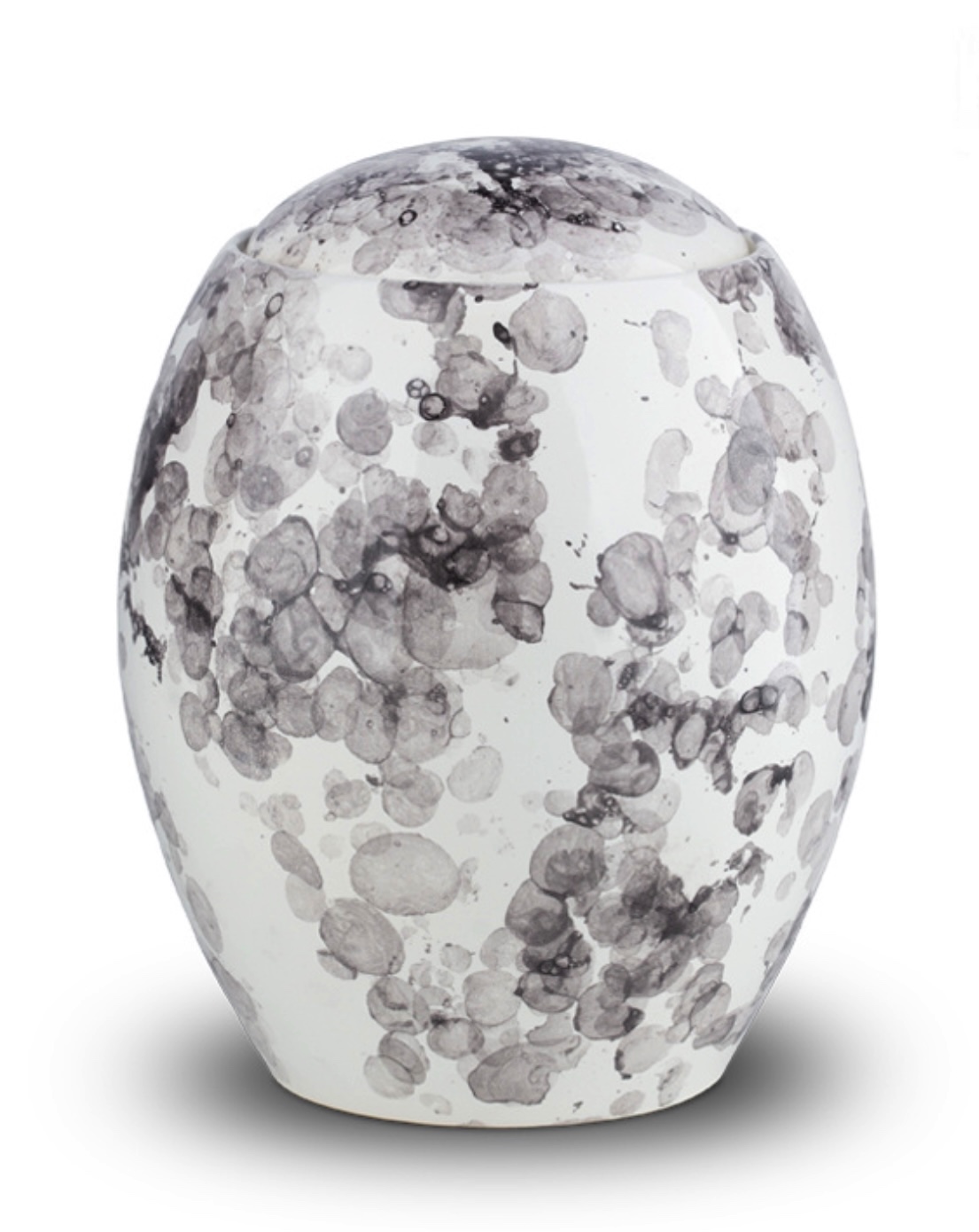 Dit model is een stijlvolle ovale urn met een opvallend patroon van bubbels. Een decoratie die zijn inspiratie in de natuur vindt. Iedere urn heeft een uniek ‘schuimpatroon’, wat het product tot het een heel persoonlijke asbestemming maakt. Het is een bijzonder kunstwerk dat tot zijn recht komt in vrijwel elk decor.