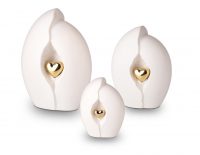 Keramieke urn waarbij het gouden hart op de breuklijn ligt van twee...